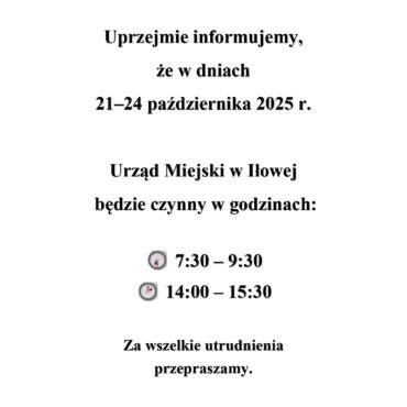 📢 Zmiana godzin pracy Urzędu Miejskiego w Iłowej
