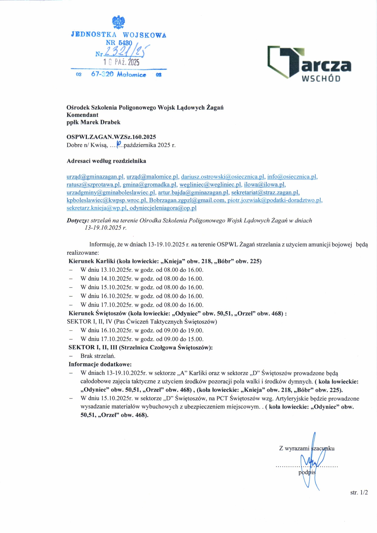 Informujemy mieszkańców Gminy Iłowa, że w dniach 13–19 października 2025 r. na terenie Ośrodka Szkolenia Poligonowego Wojsk Lądowych (OSPWL) Żagań prowadzone będą planowe strzelania wojskowe.