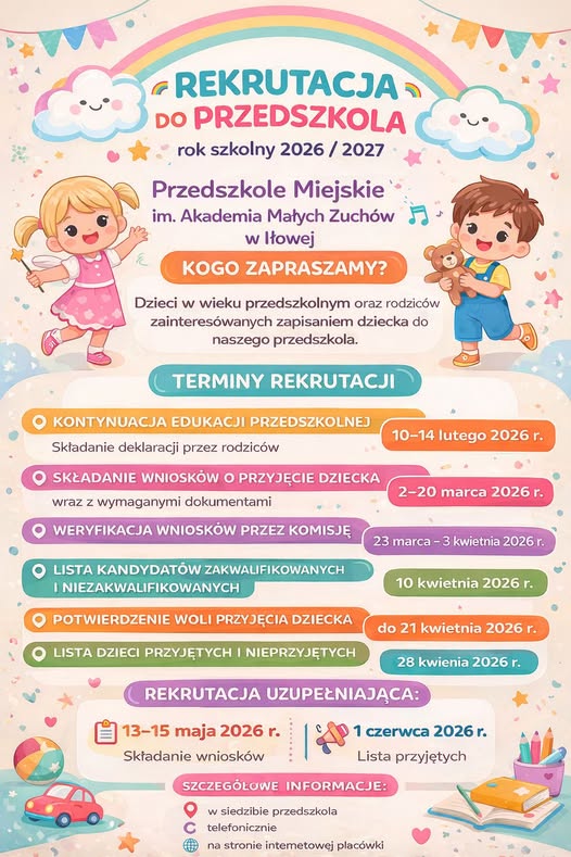 Informujemy, że dostępny jest harmonogram rekrutacji oraz postępowania uzupełniającego na rok szkolny 2026/2027 do Przedszkole Miejskie w Iłowej im. „Akademia Małych Zuchów”